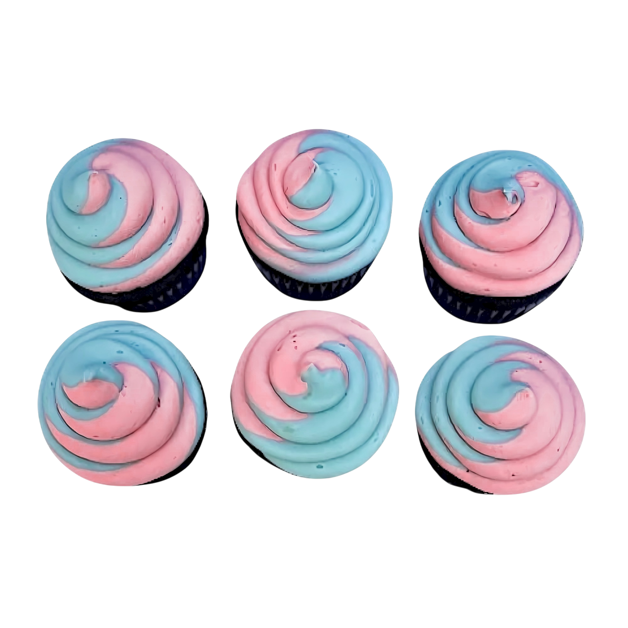 Your choice of cupcake flavor topped with a blue and pink buttercream swirl and filled with a sweet reveal of pink or blue vanilla buttercream