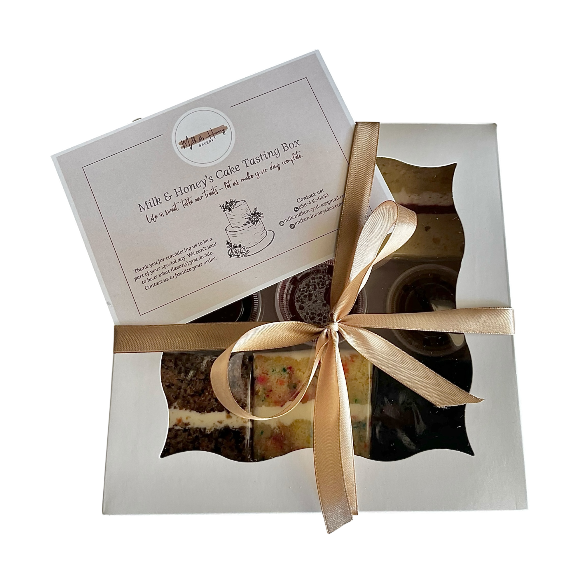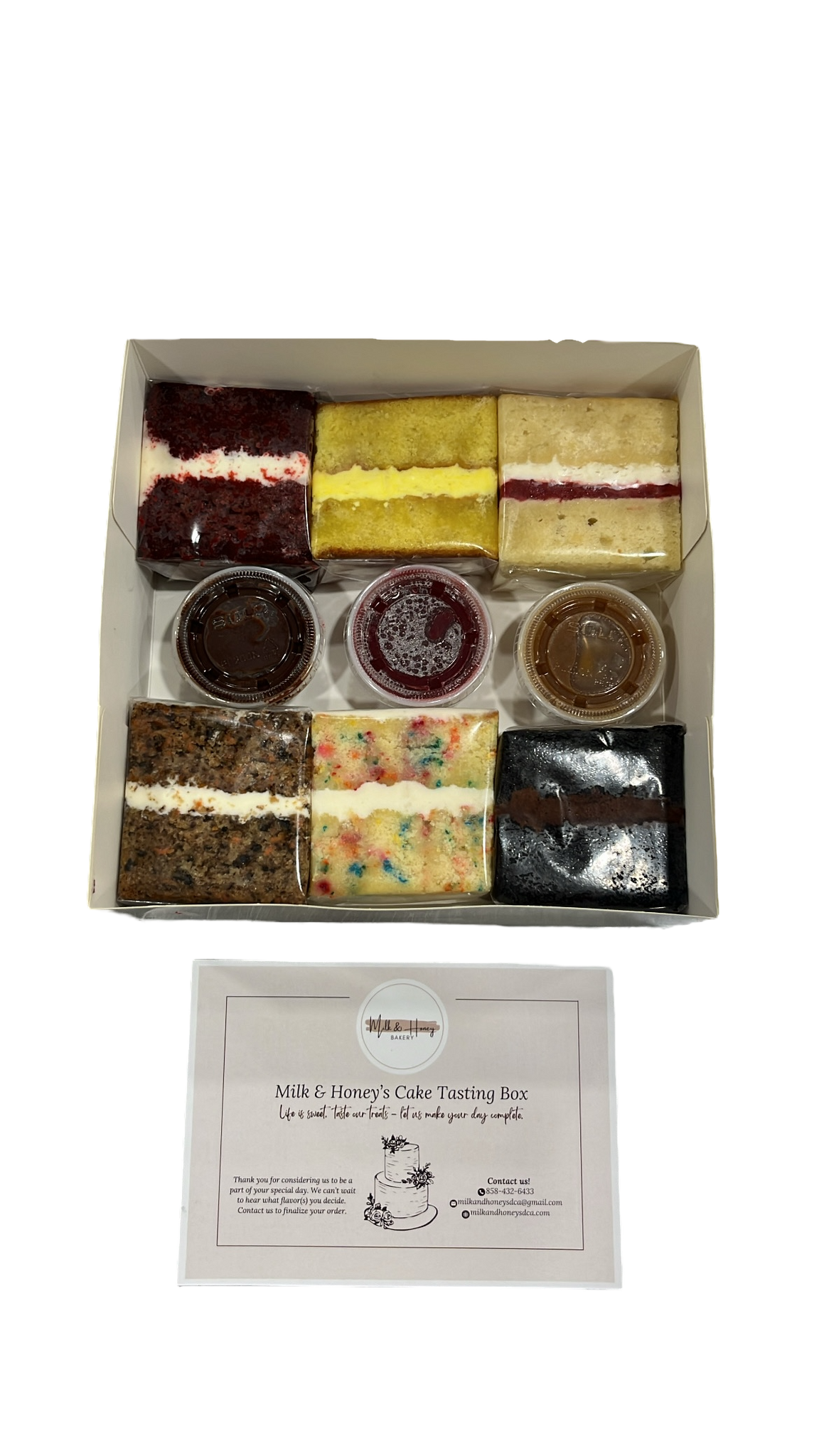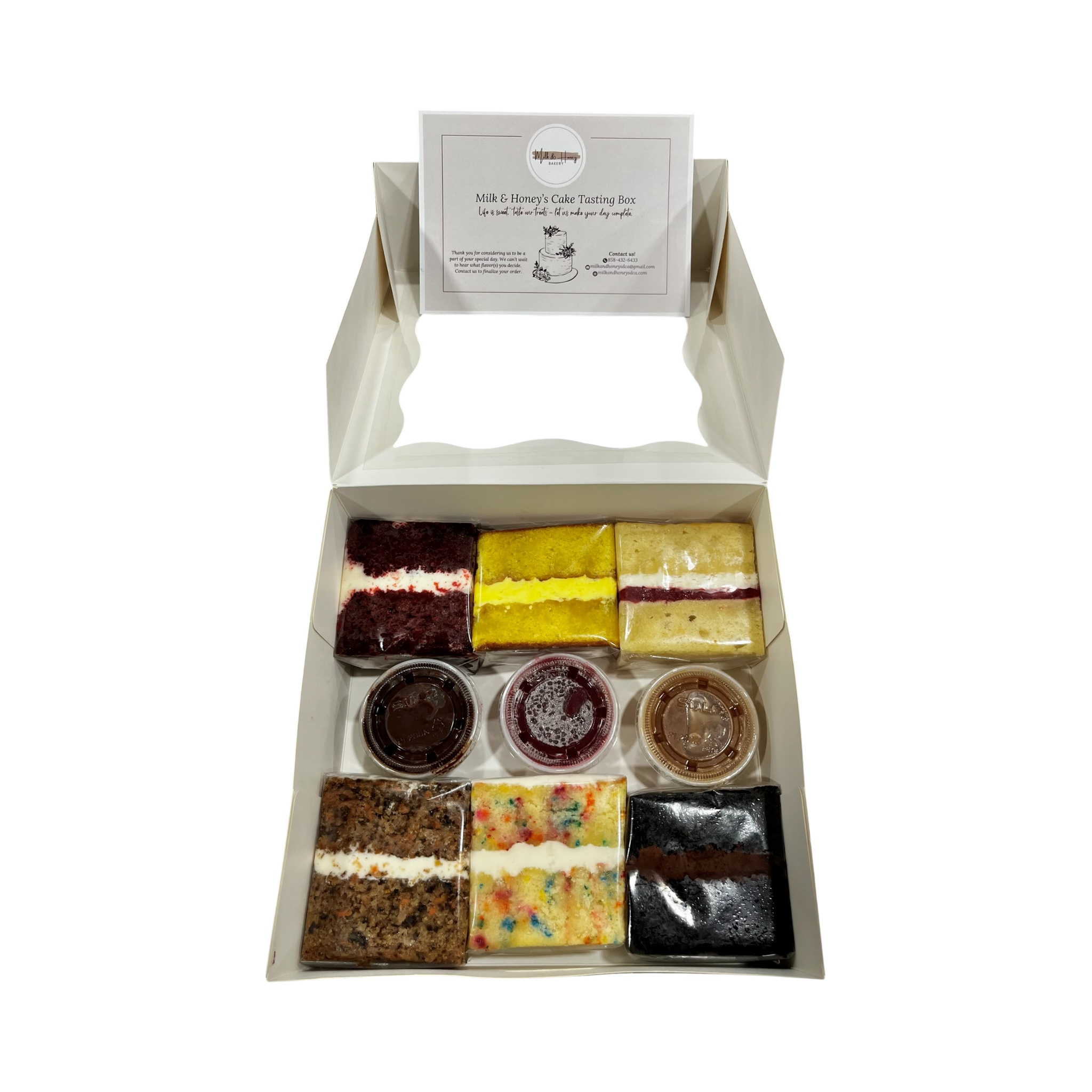 Indulge in a little taste of our most popular cake options, because picking just one is overrated. Each box includes 6 generous 3"x3" slices of the following: