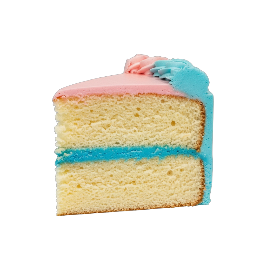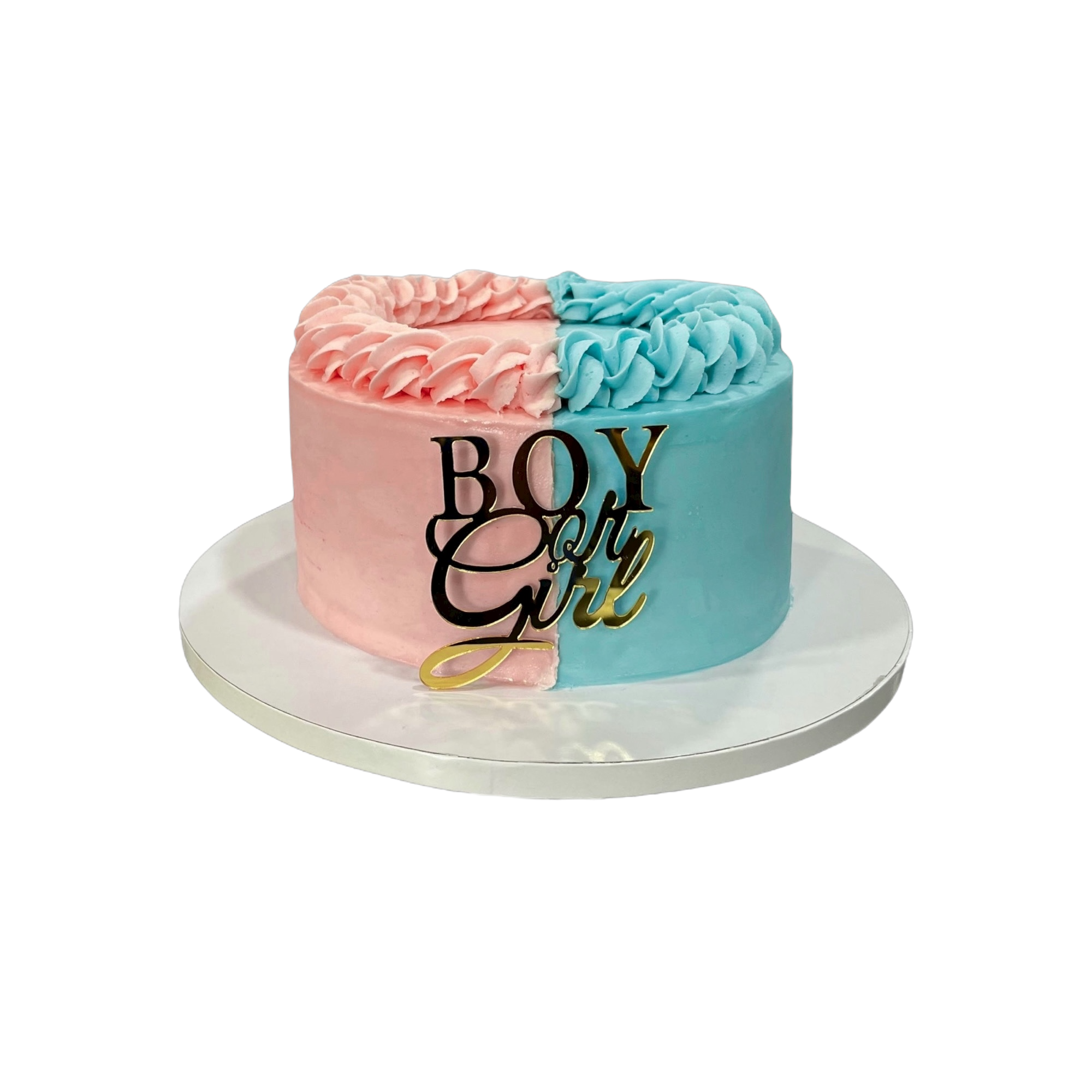 Your choice of cake flavor frosted with half Baby Pink vanilla buttercream and half Baby Blue vanilla buttercream on the outside. Inside filling will be tinted pink or blue based on gender selection.