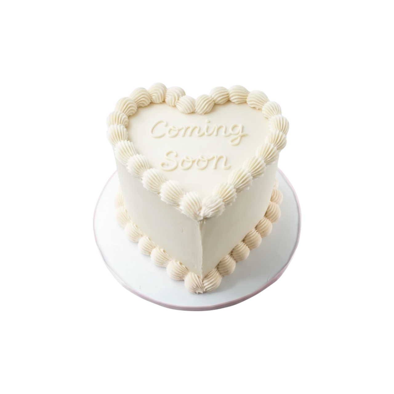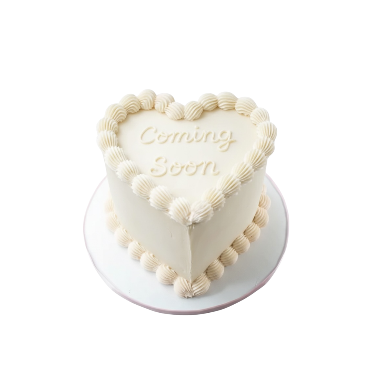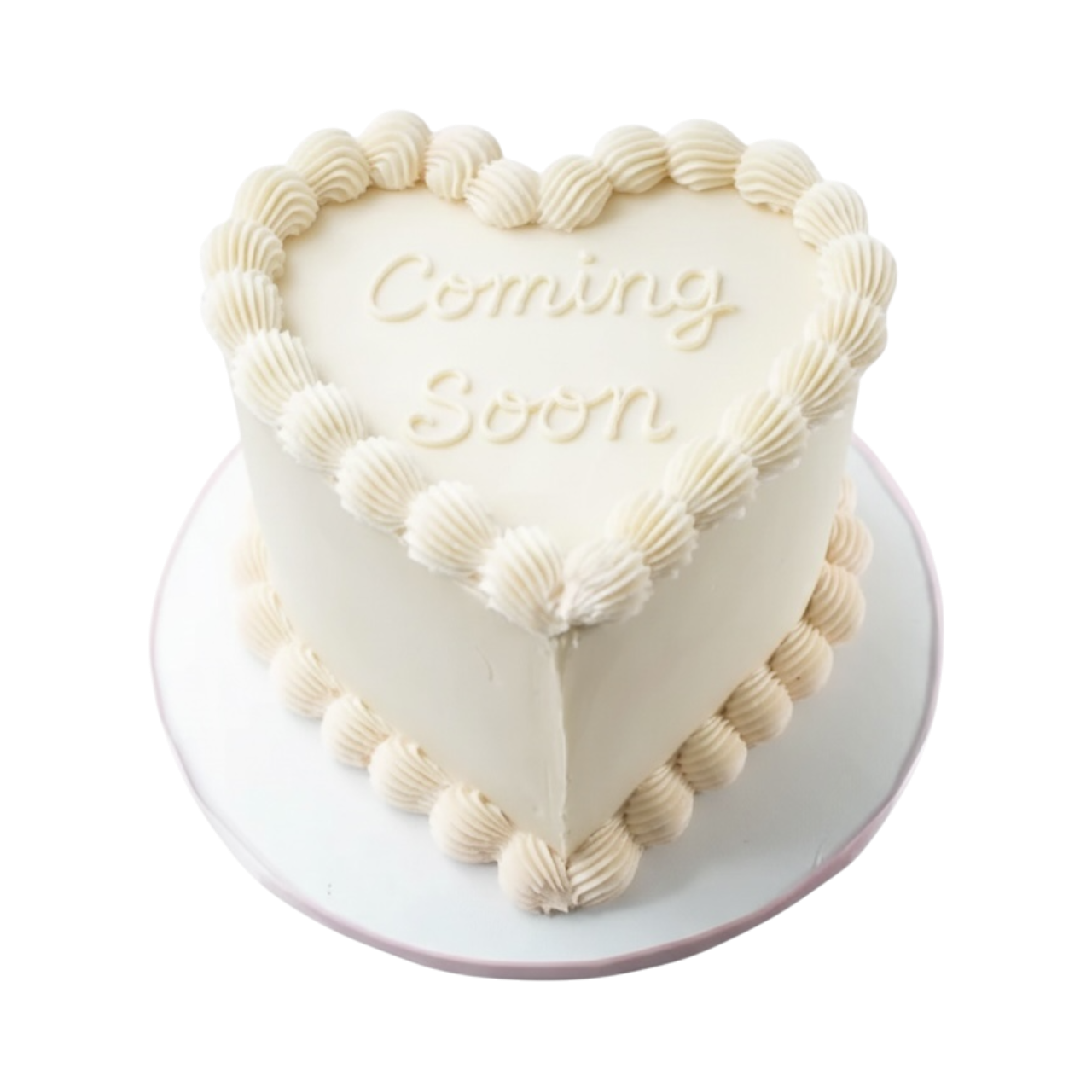 A simple but elegant heart cake—perfect for a sweet and subtle reveal. This cake features vanilla buttercream with a "Coming soon" announcement on top.